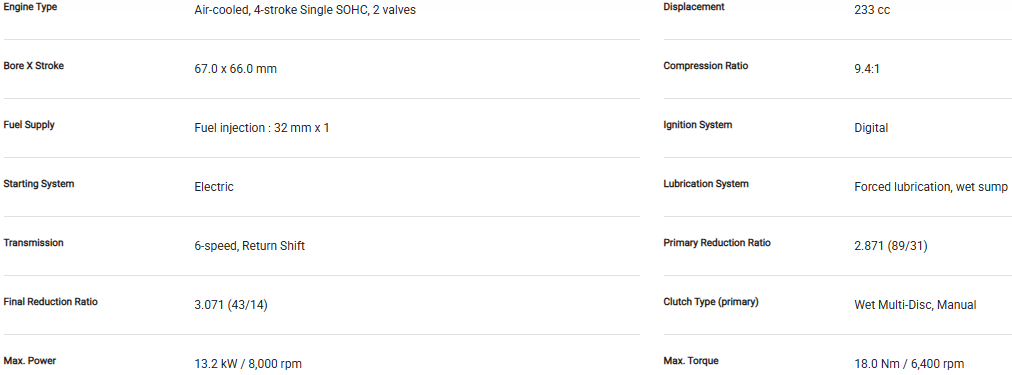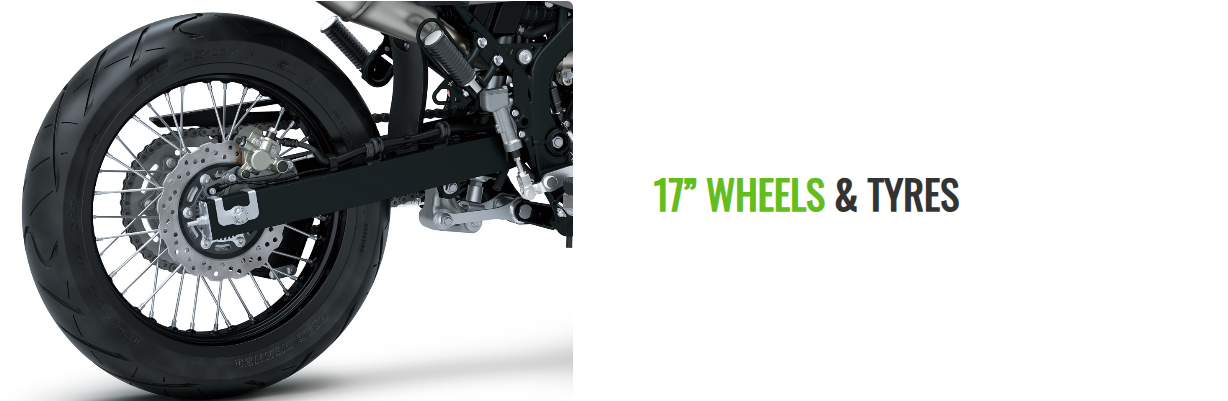 KLX230SM was developed with the same “Powerful, Light, Manoeuvrable” mission as the dual purpose KLX230. The super motor model features 17-inch wheels, street-oriented tyres and a suspension tuned for pavement to create a model ideally suited to street riding.
